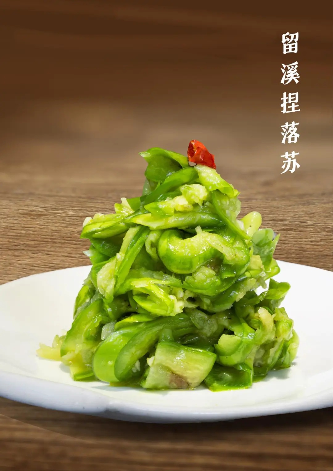 留溪捏落苏,即腌茄子,是金山张堰地区流行的一道凉菜。腌好的青茄子清灵诱人,香味扑鼻。早餐搭配着白粥吃,爽口又开胃。