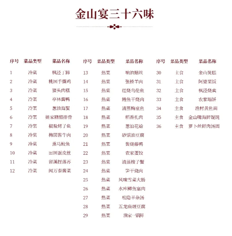 金山宴冷菜共计十二味,分别是枫泾丁蹄、桃园手撕鸡、猪头肉糕、亭林酱鸭、葱油海蜇、姚家糖醋排骨、椒盐烤子鱼、梅园酱牛肉、熏马鲛鱼、田园蛋皮丝、留溪捏落苏、闻万泰酱菜。