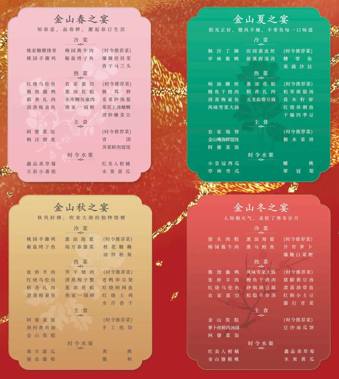 自古以来,中国人的饮食遵循着大自然的规律,顺时养生,应时食补,遵时食养,不时不食,时食有节,时养有道。春夏秋冬,滋味流转,让我们用一场金山宴,品味不同季节的味道,领略金山四季变迁的风情。