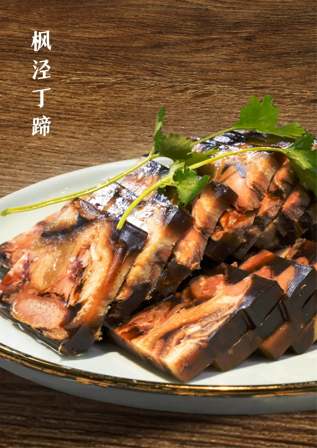 枫泾丁蹄,集中华老字号、上海市著名商标、上海市非物质文化遗产等称号于一身。丁蹄色如琥珀、剔透晶莹,卤汁渗入猪蹄内层,酥而不烂,油而不腻,咸甜相宜,既可热吃又可冷食,且冷食风味更佳。