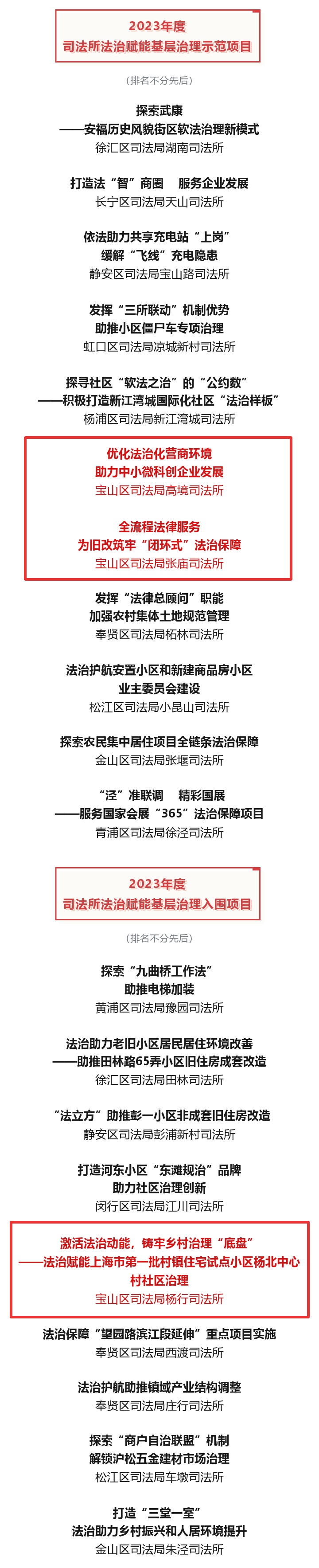 高境司法所“优化法治化营商环境 助力中小微科创企业发展”项目、张庙司法所“全流程法律服务 为旧改筑牢‘闭环式’法治保障”项目获评2023年度司法所法治赋能基层治理示范项目。