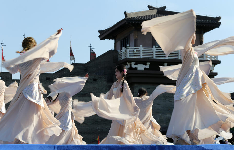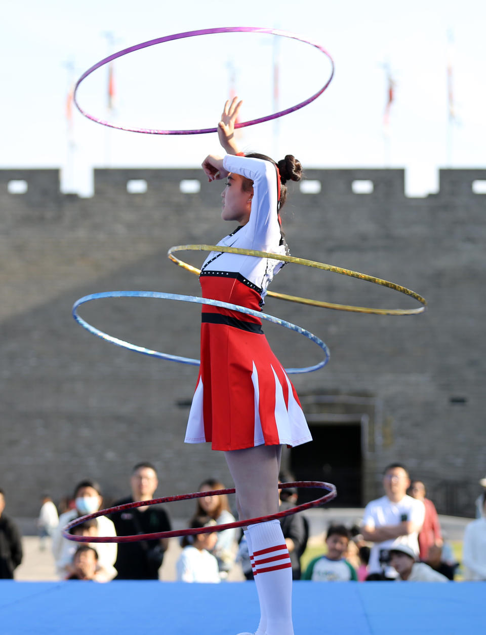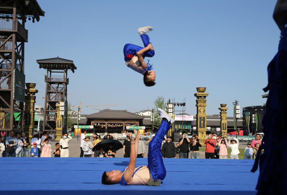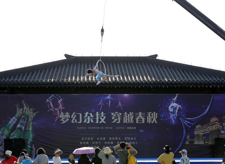 当日,郯城县郯国古城景区举行歌舞盛典、国潮演绎、杂技表演、非遗手造市集等系列活动,助力“五一”旅游市场。