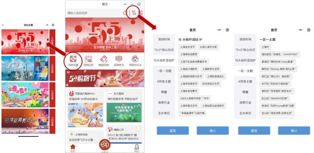 进入“主题活动”页面,可以看到全市各季活动主题内容,还可以通过点击界面右上角“筛选”图标,按照个人需求,对所在区域、临近商圈、标杆IP、特色主题、活动内容等类别进行筛选。