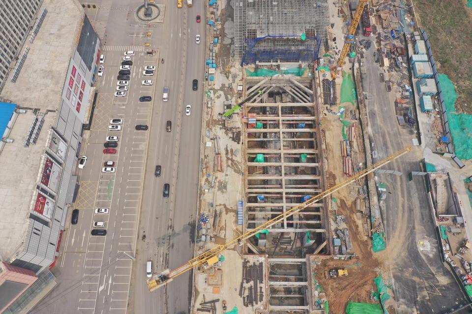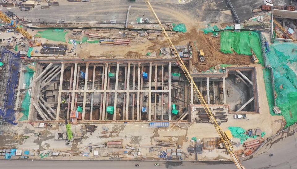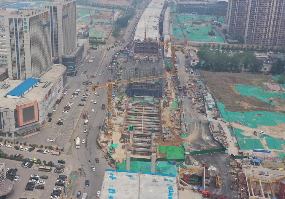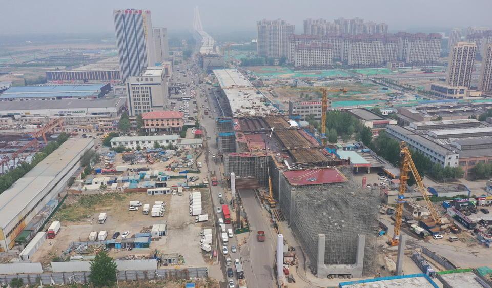 5月4日,记者航拍济南黄河大桥新桥施工工地,看到工人们正在忙碌中。原来大桥路上方,一座巨型高架桥正在崛起。巨大的墩柱上,高架桥的大部分桥面即将建成。