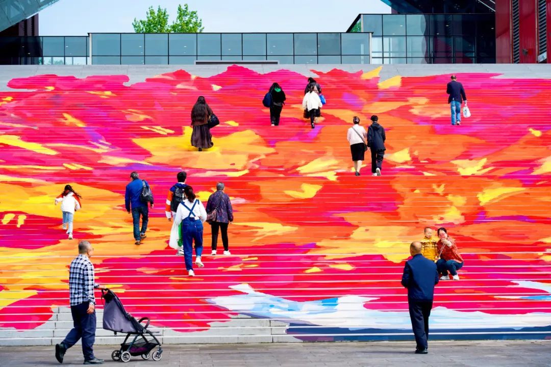 “五·一”长假,正是走进中华艺术宫(上海美术馆)欣赏中华艺术之美的绝佳时机。为迎接假日观展的观众,中华艺术宫(上海美术馆)以正在馆内“中国式风景”展出的林风眠作品《菖兰》为灵感,在南广场的大台阶上创新更换了新装扮,让观众一步入美术馆就能为“中国式风景”的传统文化之美驻足吸引。