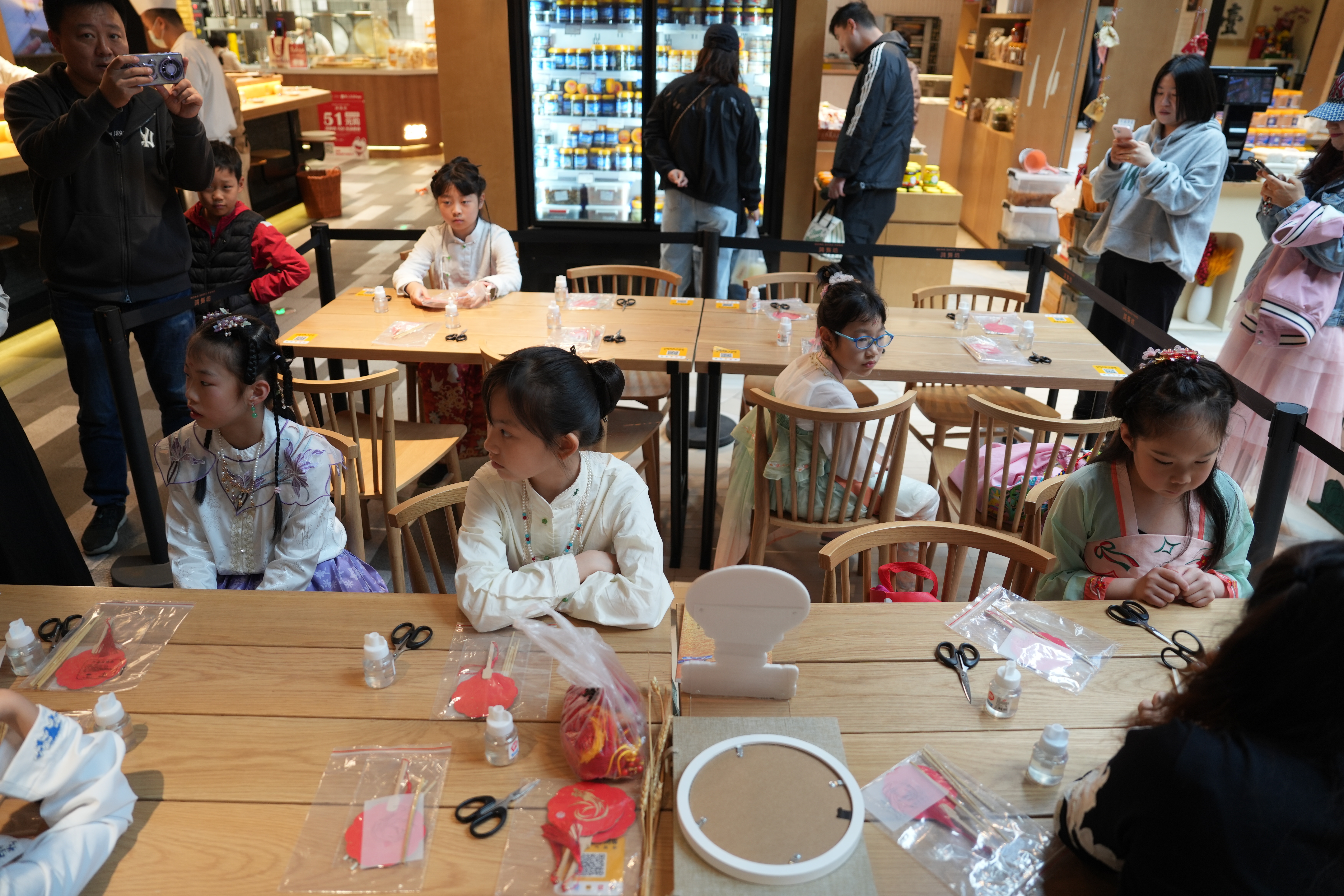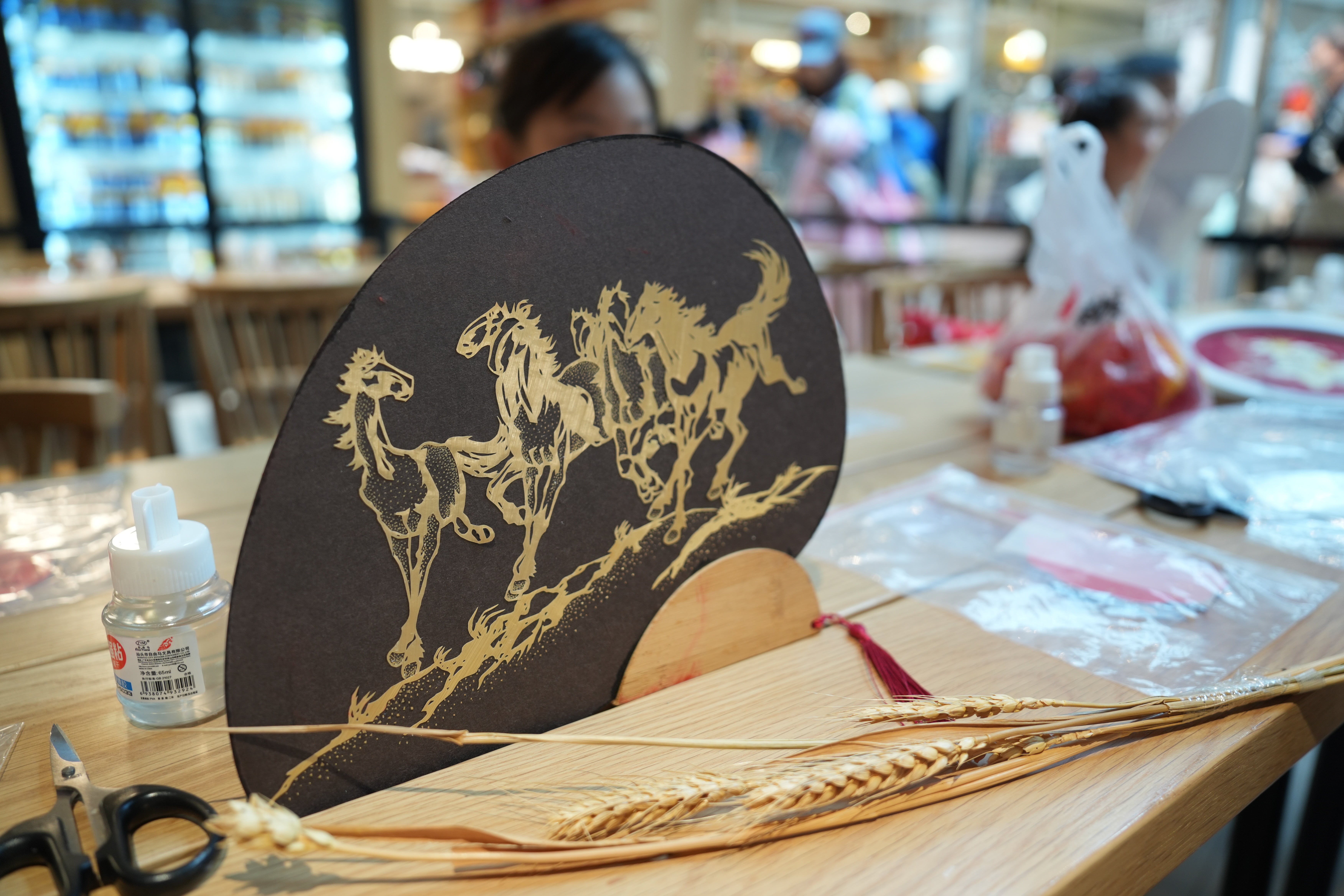 在商场市集内,麦秆画作为上海市传统工艺美术技艺、普陀区非物质文化遗产,传承人姚懿佳正在亲手为一群年轻的小朋友教授何为麦秆画、并用来自全国各地的麦秆制作团扇。这种纤细的画作在传承人匠心巧手下,正变成一个个动物形象跃然眼前、栩栩如生。