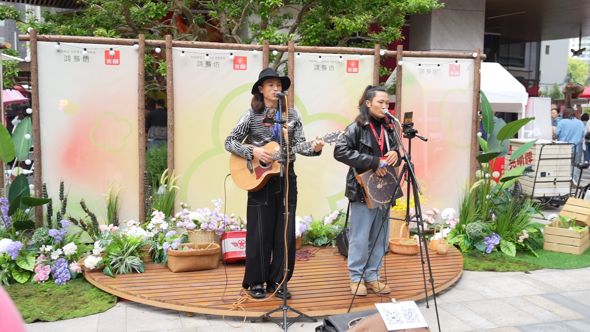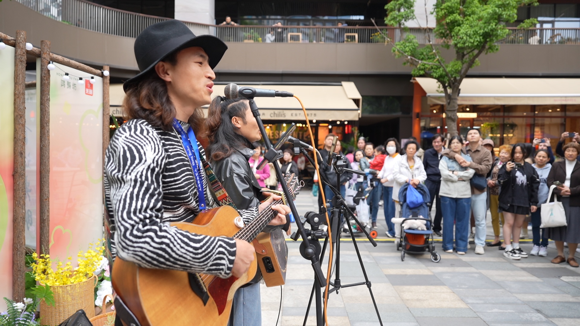 在鸿寿坊公区广场,激情澎湃的歌声、律动的击鼓萦绕着商场,引得现场的市民围拢在一起摇摆歌唱。正在表演的是阿余尔洛和鲁明全,他们胸前佩戴者街头艺人表演证。