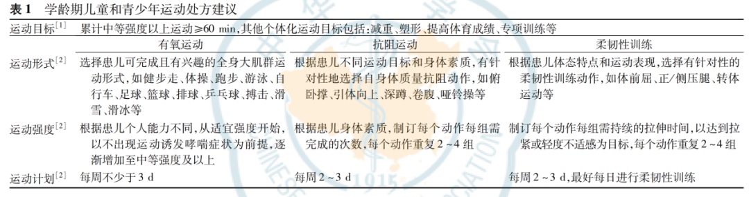 应遵循安全、科学、个体化的原则,使运动处方的目标、内容和运动计划适合患儿年龄特点、哮喘控制状态、营养和发育水平、身体素质。制定具体运动处方,应从适合患儿个体特点的初步计划开始,循序渐进地达到运动目标,内容包含运动频率、运动强度、运动方式、运动时间、总运动量等。