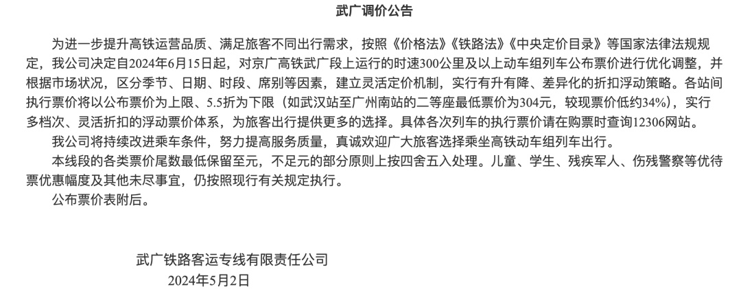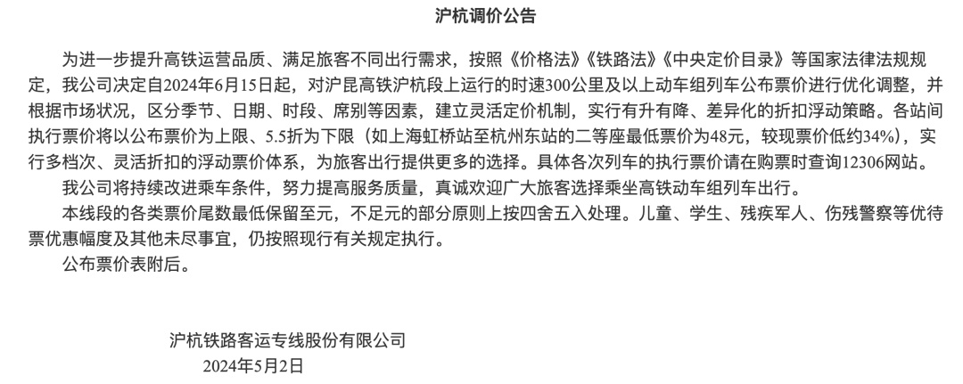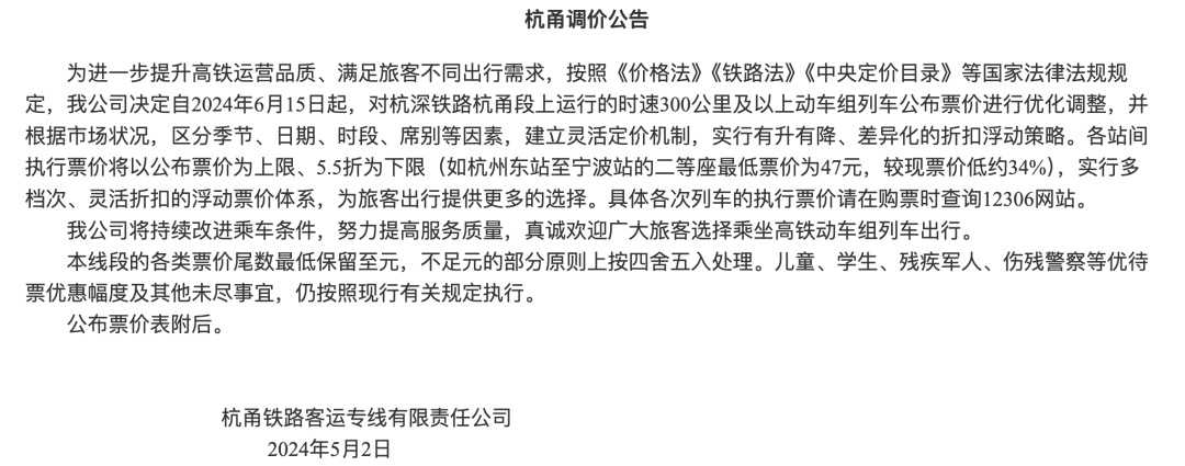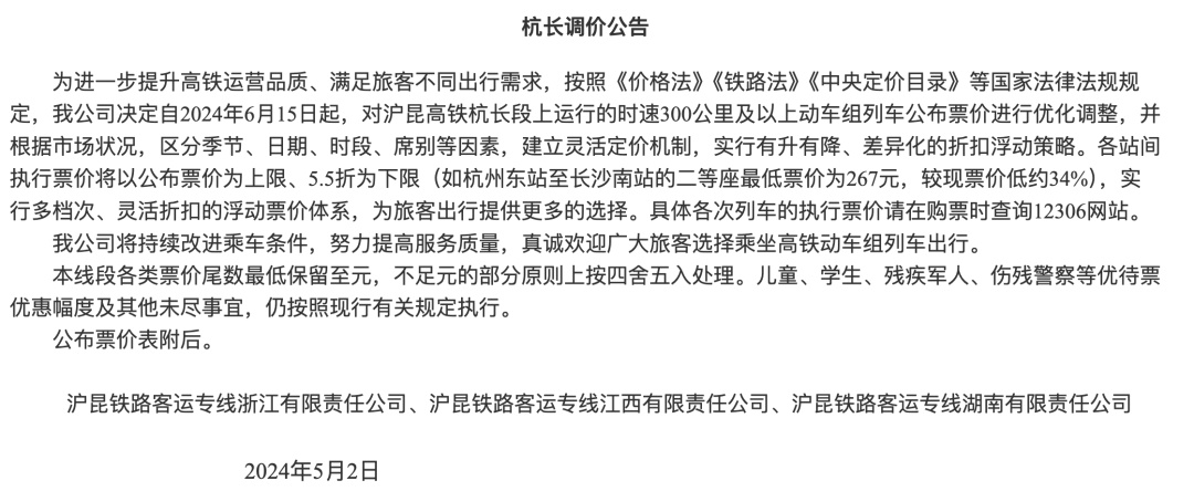 公告指出,为进一步提升高铁运营品质、满足旅客不同出行需求,决定自2024年6月15日起,对京广高铁武广段、沪昆高铁沪杭段、沪昆高铁杭长段、杭深铁路杭甬段上运行的时速300公里及以上动车组列车公布票价进行优化调整,并根据市场状况,区分季节、日期、时段、席别等因素,建立灵活定价机制,实行有升有降、差异化的折扣浮动策略。