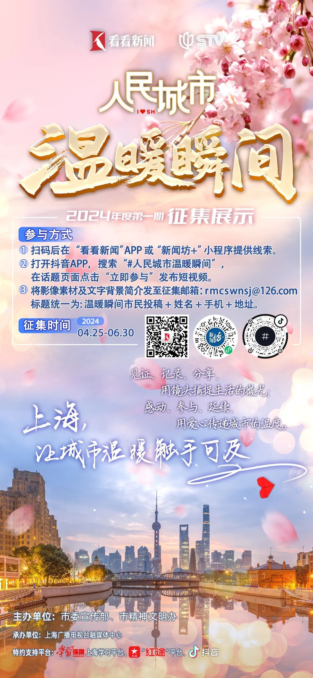2024年度第一期“人民城市 温暖瞬间”征集展示活动已经启动!市委宣传部、市文明办、上海广播电视台诚邀大家成为“温暖推荐官”,拿起镜头捕捉生活的微光,记录普通人身上的闪耀瞬间以及触动心弦的“奇遇”时刻,分享传递直抵人心的温暖力量。征集方式、时间详见↓
