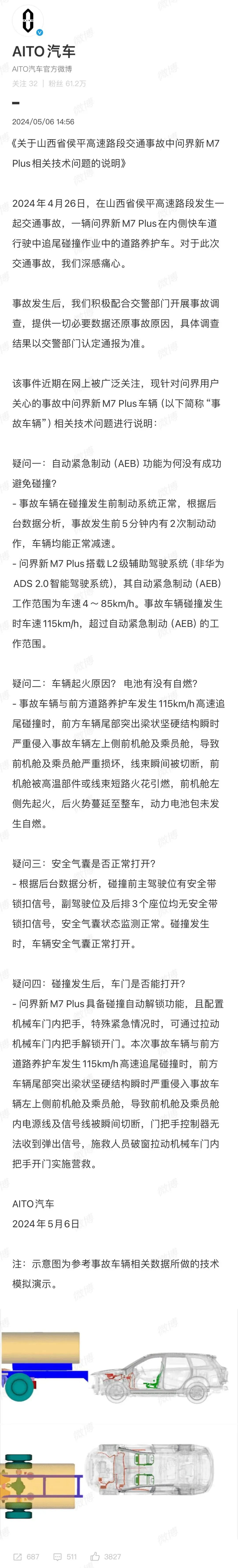 5月6日下午, AITO汽车官方微博发布《关于山西省侯平高速路段交通事故中问界新M7 Plus相关技术问题的说明》,首次披露其官方调查的结果。