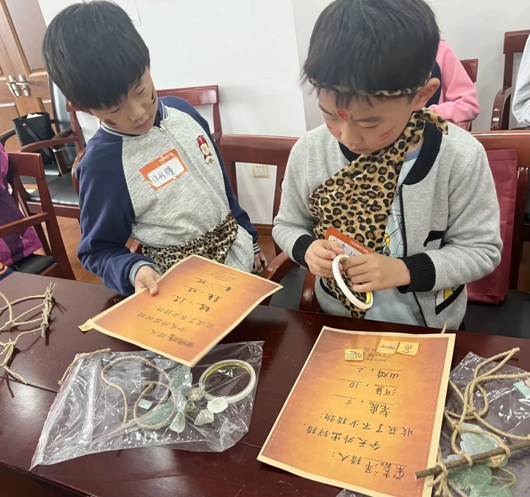 看完故事演绎后,到了“实战”的环节。孩子们和老师出发去“狩猎”,一起学习用“结绳记事”“符号记事”等方法来统计狩猎的成果,并通过简单的绳结以及象形符号制作属于自己的狩猎单。孩子们在游戏中体验了古人记录的方式,认识到了文字出现所带来的巨大便利,感受到了汉字的魅力。