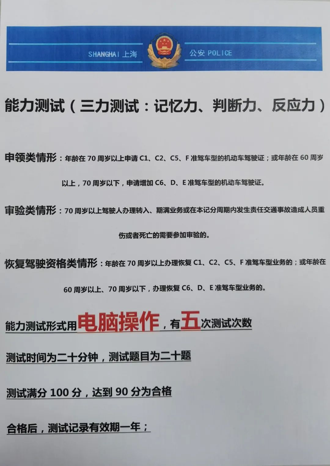 朱祎芸介绍,年满60周岁的驾驶人办理驾驶证降级,在完成体检且手续齐全的情况下,直接到车驾管业务窗口就可当场办理。不过,年满70周岁,需要办理驾驶证申领、审验、恢复驾驶资格等业务的驾驶人,除了体检还要通过能力测试,俗称“三力”测试,“包括记忆力、判断力和反应力的测试,主要是为了确定驾驶人具备驾驶机动车的身体条件,保障行车安全。能力测试为电脑操作,有5次测试次数。测试满分100分,90分合格,能力测试有效期一年。”
