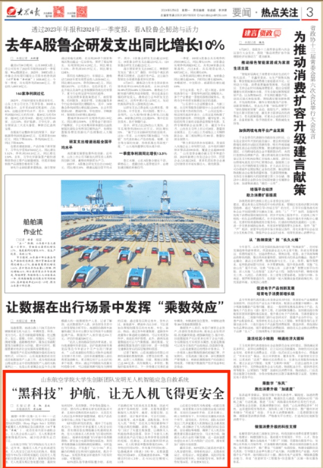 避障+伞降+反推+北斗+5G……近日,由山东航空学院飞行学院大学生创新团队KFS团队(Keep Flight Safe)发明的多旋翼无人机智能应急自救系统(以下简称“系统”),成功在省内部分通航企业、无人机企业投入运行,无人机事故率整体降低约30%,减少经济损失近百万元。