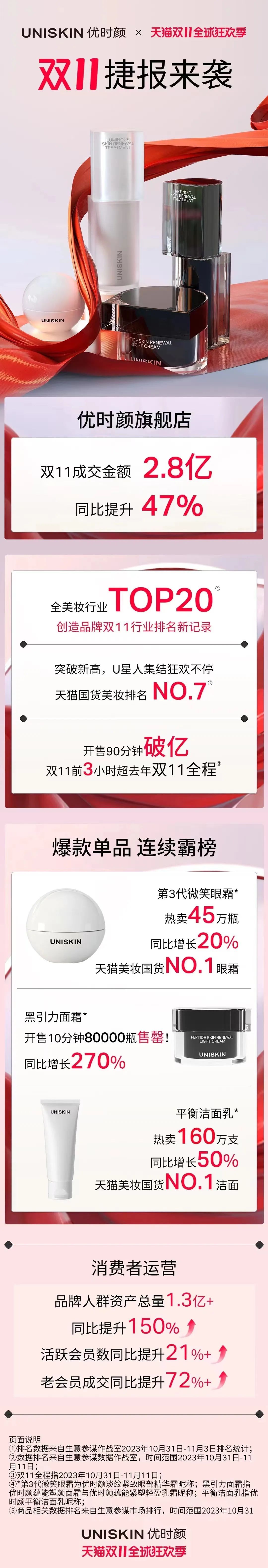 去年“双11”,优时颜旗舰店成交金额2.8亿元,同比提升47%,位列全美妆行业TOP20,创造品牌双11行业排名新纪录,位列天猫国货美妆排名NO.7。其中,爆款单品第3代微笑眼霜热卖45万瓶,同比增长20%,跃居天猫美妆国货NO.1眼霜,黑引力面霜开售10分钟80000瓶售罄,平衡洁面乳热卖160万支,同比增长50%占据天猫美妆国货NO.1洁面。