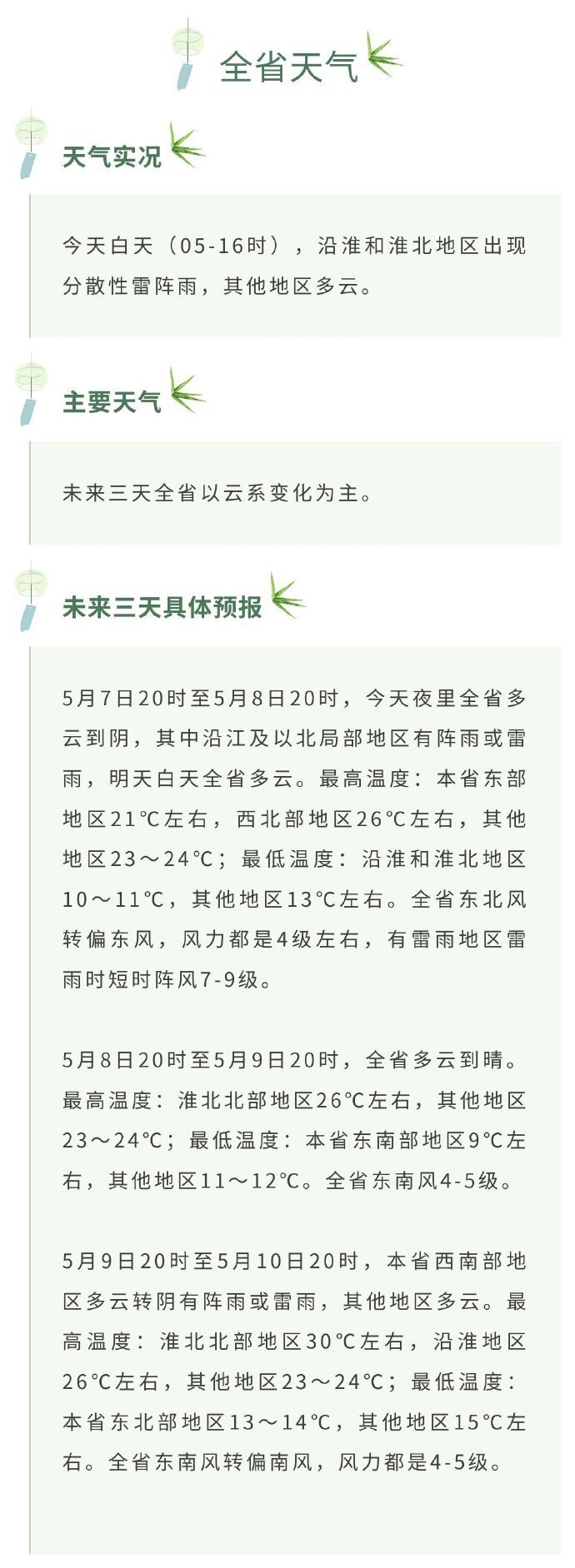 未来三天全省以云系变化为主。5月7日20时至5月8日20时,今天夜里全省多云到阴,其中沿江及以北局部地区有阵雨或雷雨,明天白天全省多云。最高温度:本省东部地区21℃左右,西北部地区26℃左右,其他地区23~24℃;最低温度:沿淮和淮北地区10~11℃,其他地区13℃左右。全省东北风转偏东风,风力都是4级左右,有雷雨地区雷雨时短时阵风7-9级。