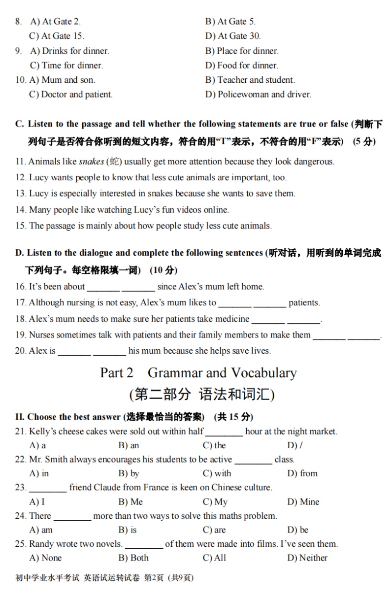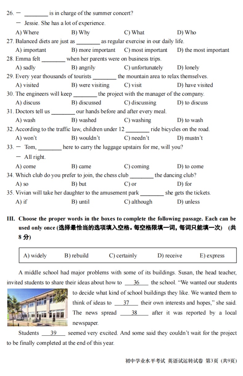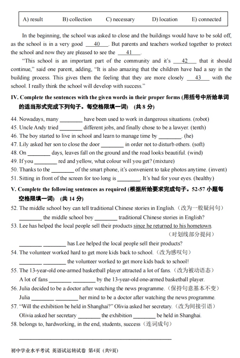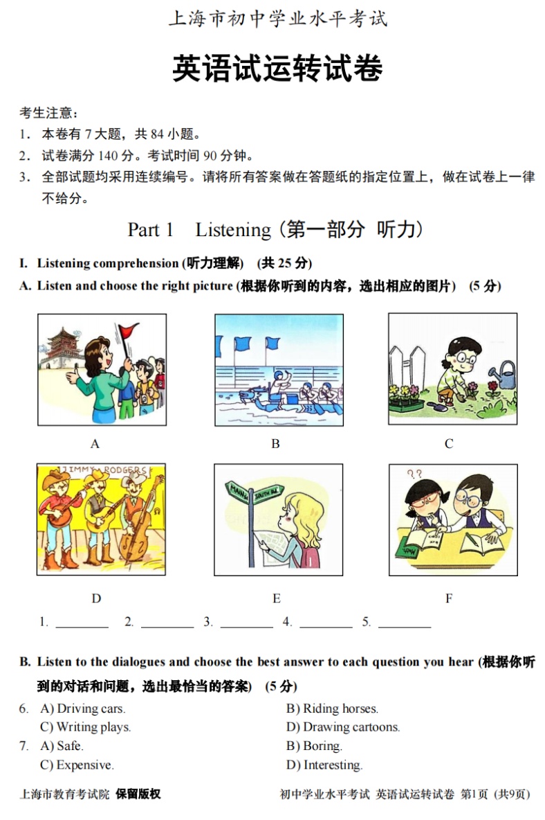 上海市初中学业水平考试英语试运转试卷