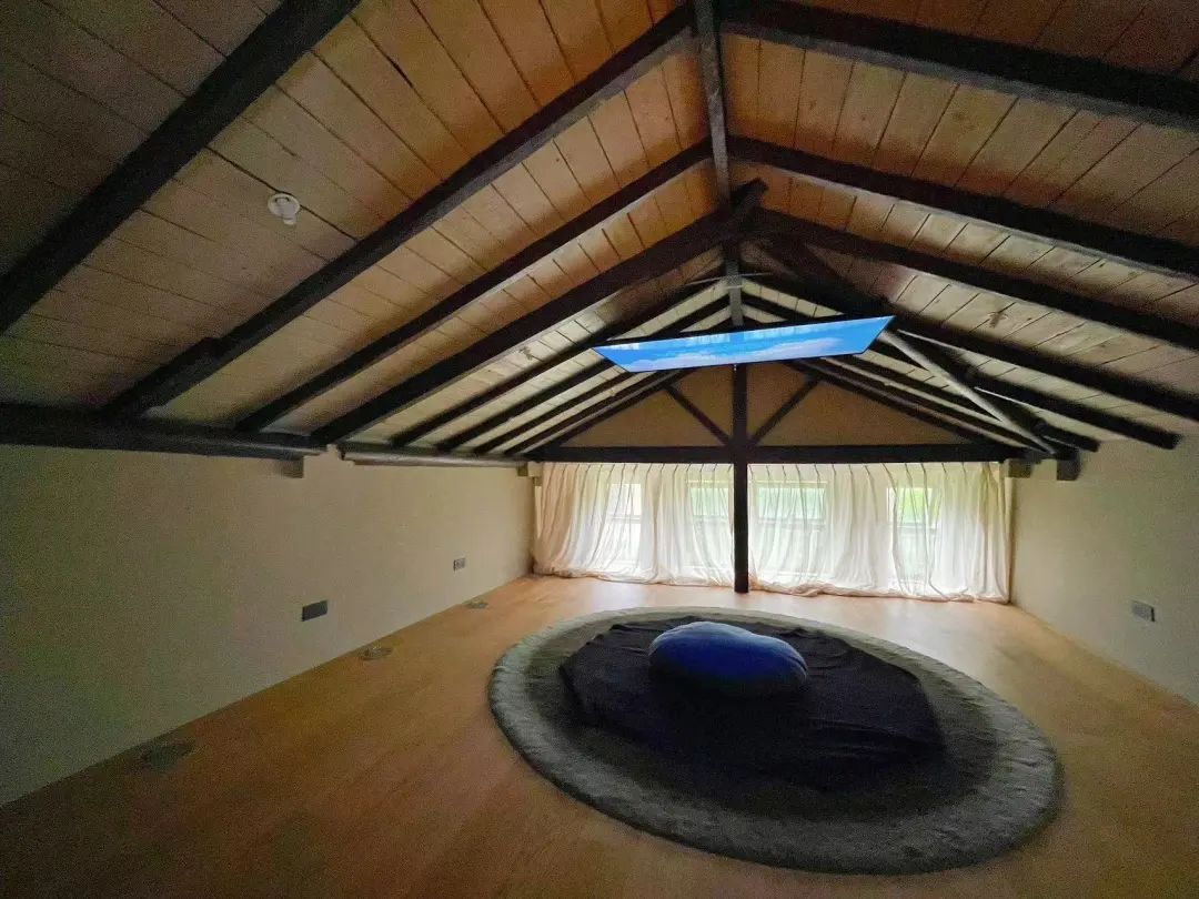 策展人和建筑师将电视机倒挂于阁楼顶部,打造出一个地圆天方的观看场景,暗喻宇宙空间,从一楼最初的自然万物,指向了未来。