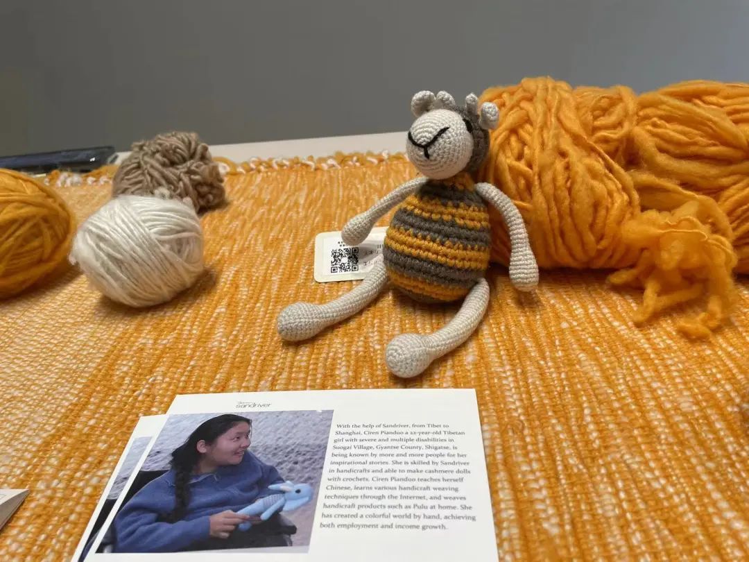 无法行走的藏族姑娘次仁片多,靠着自学的技艺在家编织出了氆氇手工艺产品。郭秀玲深受触动,特地教授她羊绒纱线的钩针技能。