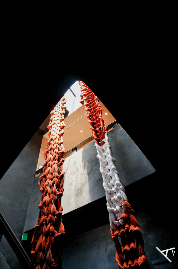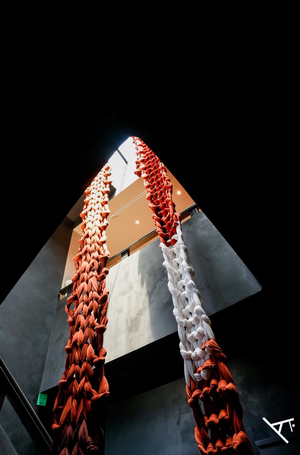 盘旋而上的楼梯,环抱着白红相间的萨迦色编织物,从十几米高的黑色楼梯间直垂而下,犹如攀援的绳索,亦如饱满的青稞粒。