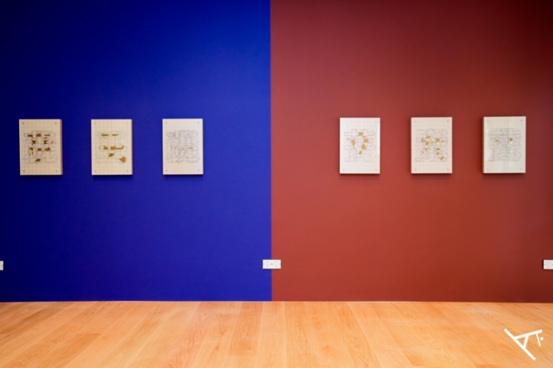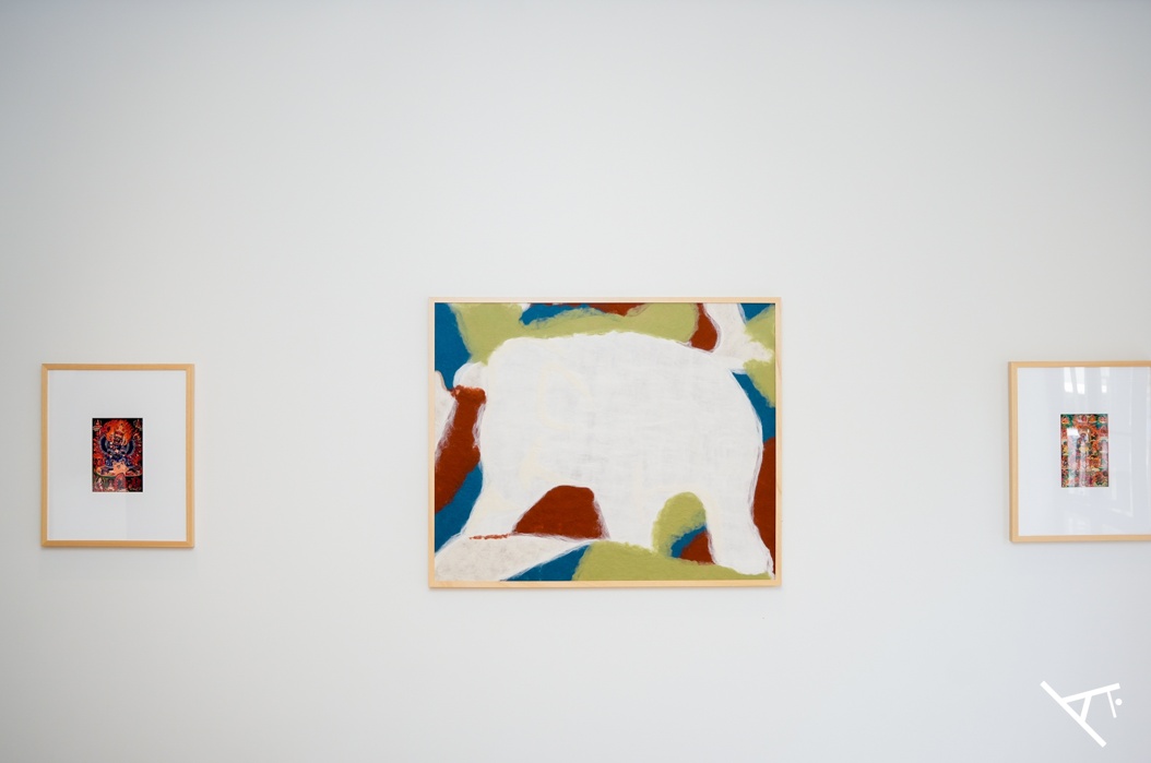 艺术家廖斐带来作品“交集物”,通过蓝红撞色,将数理系统所带有的平衡感转化成视觉语言,与一楼同样位置的两幅唐卡相呼应。