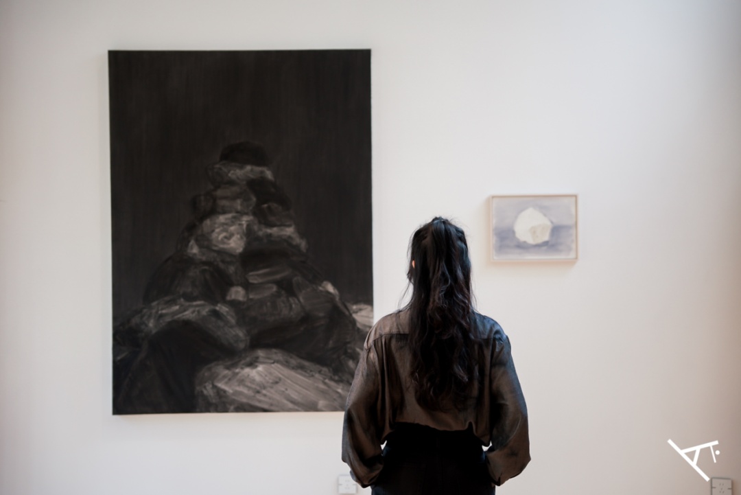 三楼的挑高空间里,黑色大幅的布面油画“玛尼堆”和白色小幅的纸本油画“白石”,带着现场观众一秒穿越至堆满玛尼石的神秘旷野。