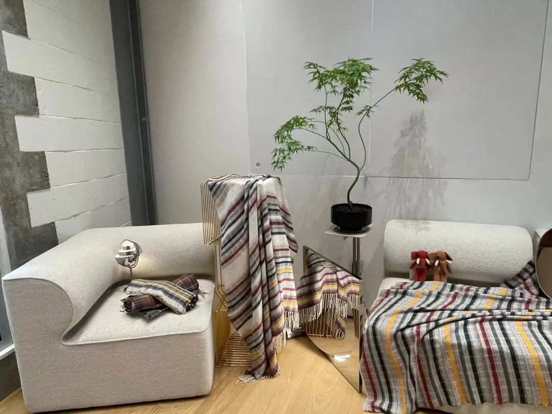 在这个独特的展览空间内,传统与现代悄然碰撞,“萨迦系列”羊绒毯随意地铺展在北欧进口的米白色沙发上,简约而舒适,一盆恰到好处的绿植,让这一幕更添悠远的禅意。