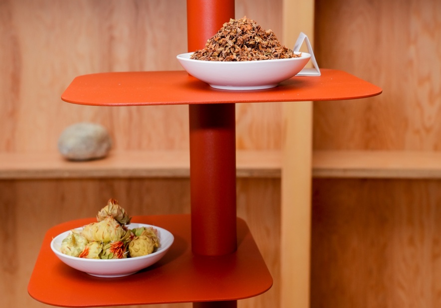 萨迦最有名的物产之一是藏香。在展厅里,黑、白、红、黄四种藏风色调的书架上,展示着藏香最原始的各种材料——从大自然采集而来的植物、石头、水、青稞……