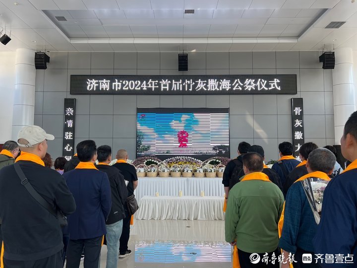 上午9时许,海葬公祭仪式在日照市殡仪馆告别大厅举行,在庄严肃穆的音乐伴奏声中,大屏幕播放海葬祭文,逝者家属手捧鲜花,带着对亲人最深沉的追思,肃立、默哀、缅怀、敬献鲜花,在此行礼送别亲人最后一程。