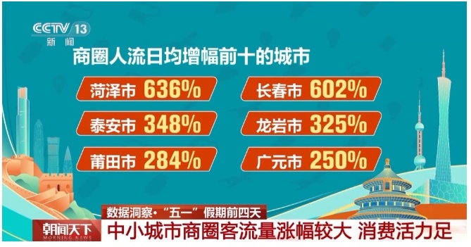 中国移动梧桐大数据对分布在各省份的3800多个商圈进行分析后发现,今年“五一”假期,菏泽市商圈客流量日均增幅为636%,位居第一。这表明菏泽的商业热度,在“五一”假期不断上升,消费活力不断释放。