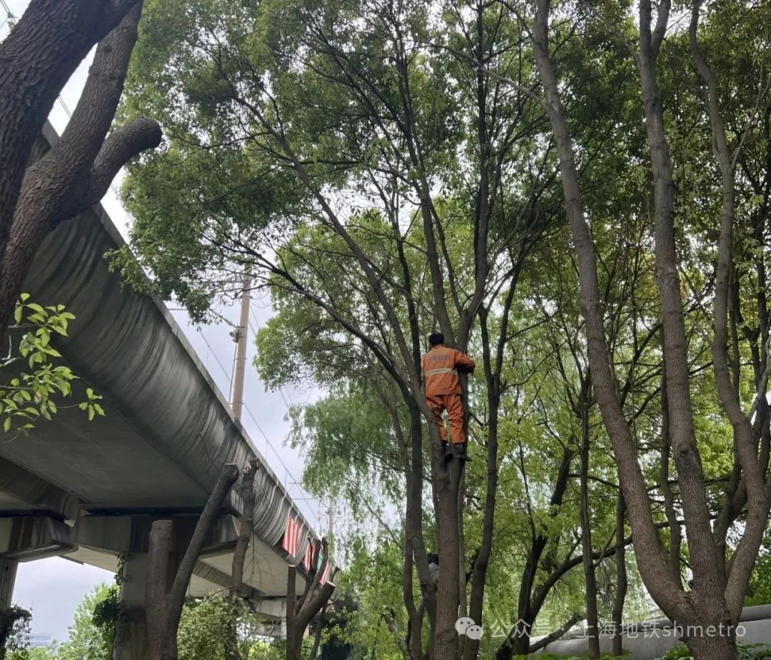 沈杜区域负责4座高架车站,为此,区域联系了园林部门,对靠近高架轨行区的树木进行了修剪,将侵限的风险降到了最低,杜绝因茂密树木造成的行车安全。