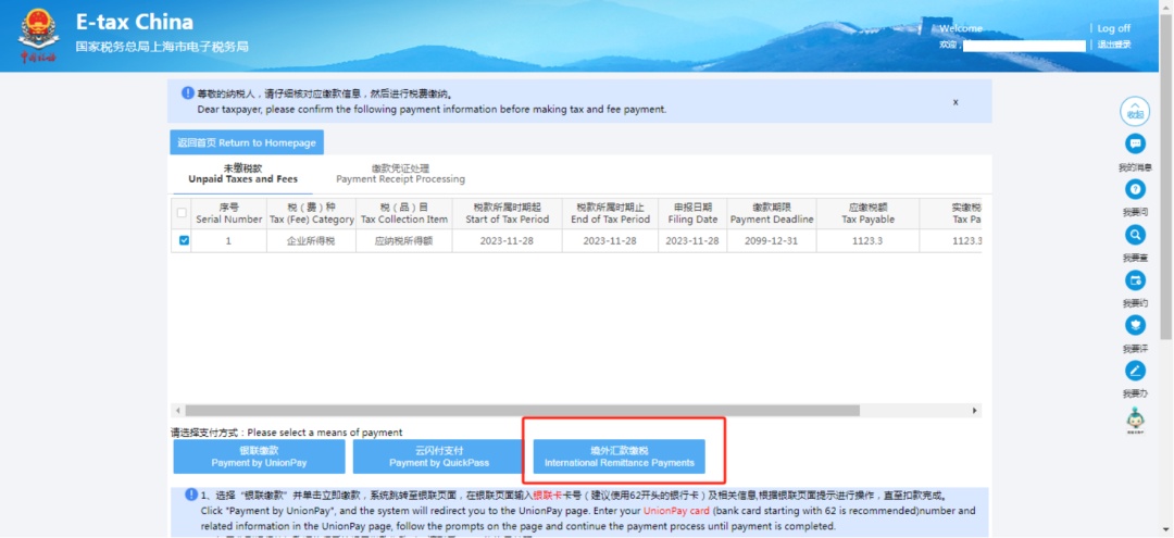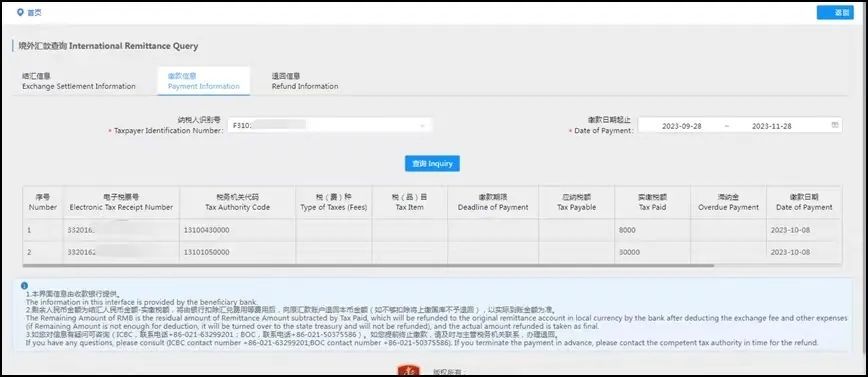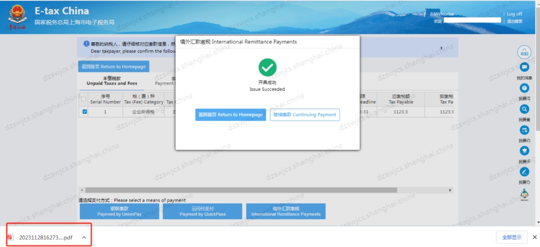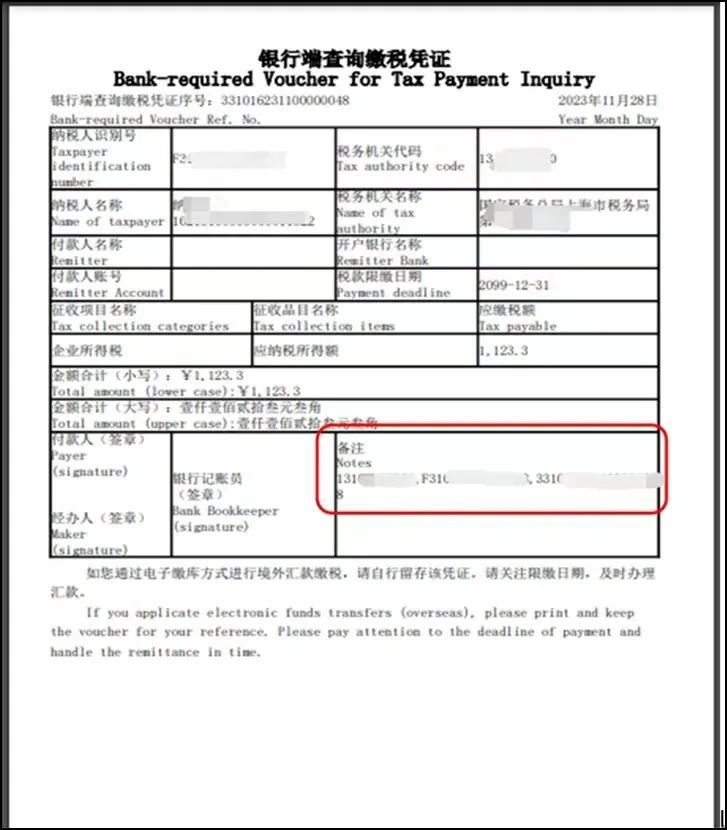 开具成功后,即可打开下载的PDF的银行端查询缴税凭证,根据凭证上的账号信息前往境外银行进行跨境汇款操作,注意汇款附言需要注明银行端三要素(税务机关代码、纳税人识别号、电子税票号码)。