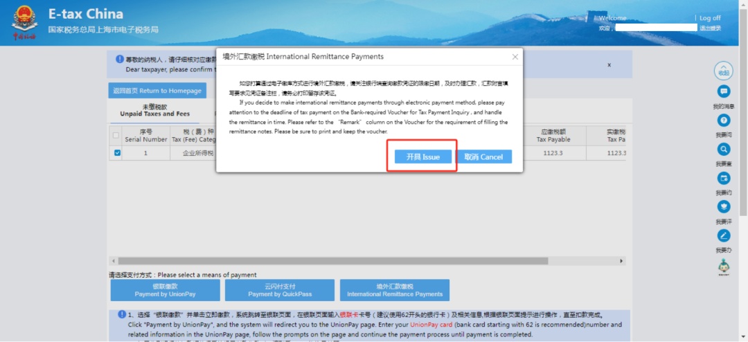 勾选对应需要缴款的数据,选择“境外汇款缴税”,阅读注意事项后,选择“开具”。