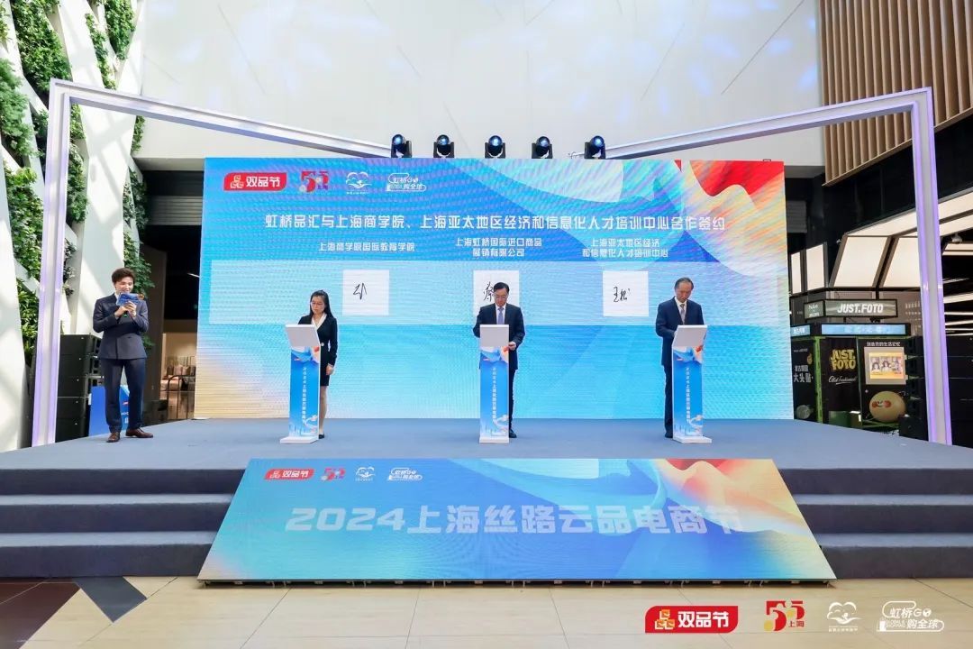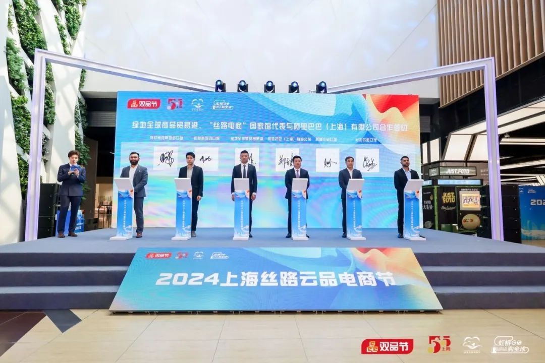 在上海深入创建“丝路电商”合作先行区、加快推动国际贸易中心建设提质升级的背景下,绿地全球商品贸易港携手“丝路电商”国家馆代表与阿里巴巴(上海)有限公司于5月7日在“2024上海丝路云品电商节”启动仪式现场进行合作签约。此次签约标志着多方将在淘宝、天猫 、天猫国际平台上共建线上国家馆,开展全球购业务,推动“丝路电商”产业链发展。