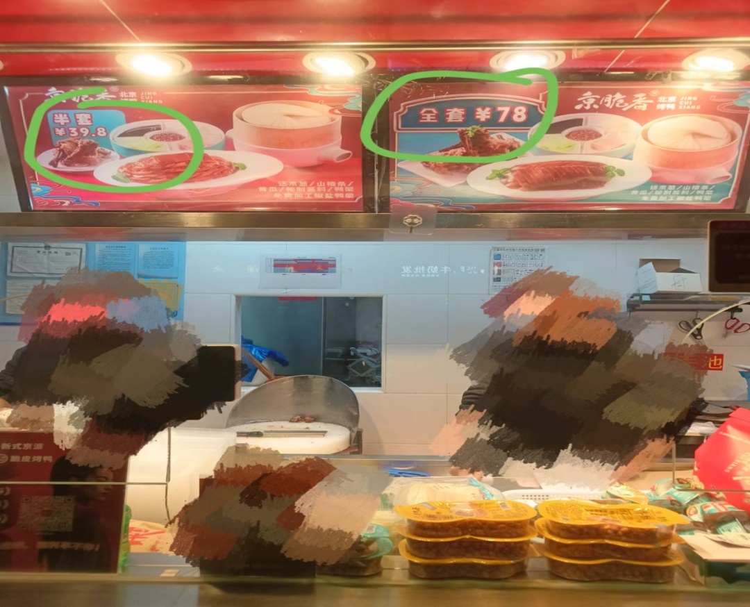 那这份菜品的真实售价到底是多少?带着疑问,我们来到了这家烤鸭店。在该家店铺招牌上显示,“半套39.8元”和“全套78元”。也就是说,在抖音和饿了么平台上,虽然商家确实有所优惠,但其标注的折扣幅度却是带有很大水分的。