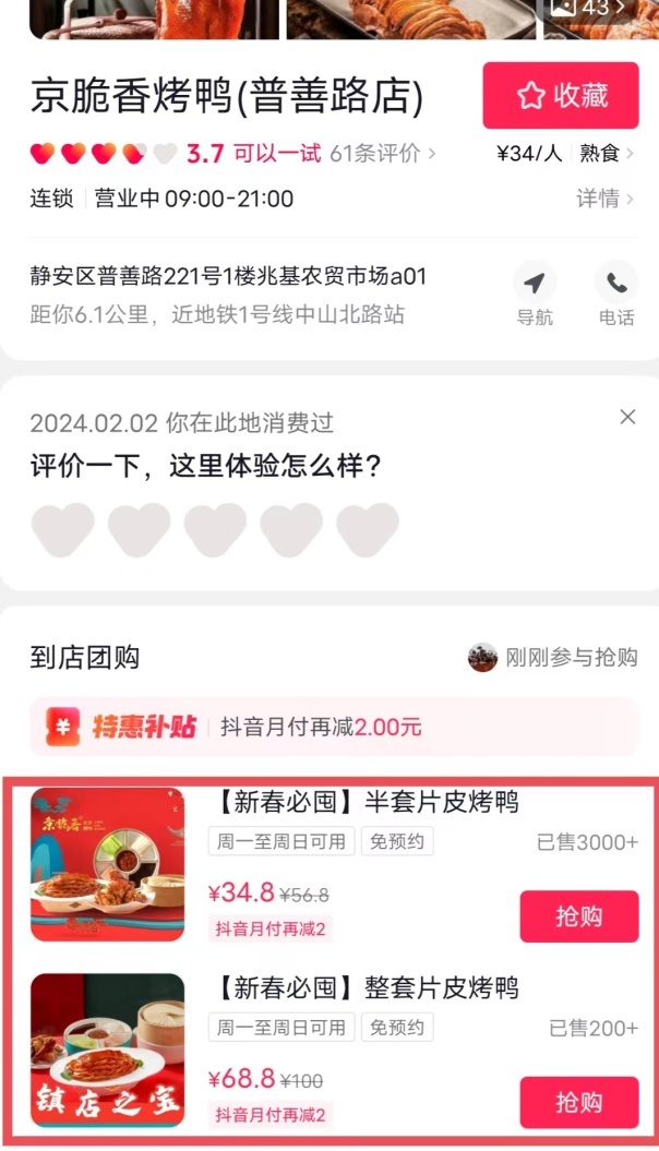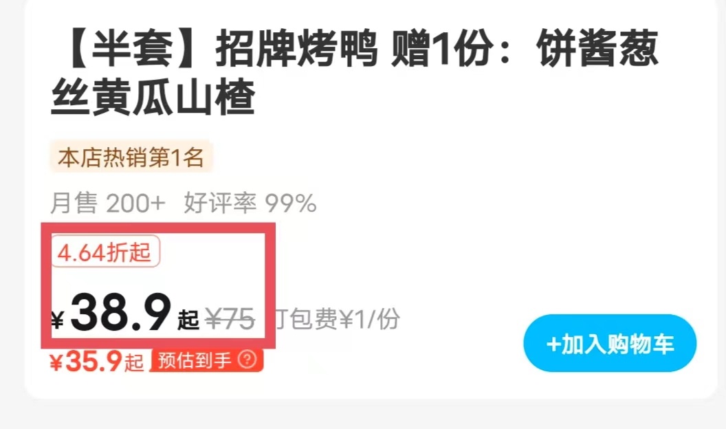 那么问题来了,我们可以理解不同平台渠道的团购优惠政策可能有所不同,但令人费解的为何划线价格差距怎么这么大?!同样的半套烤鸭套餐竟然有39.8元、56.8元和75元三个不同版本的划线价,这也直接导致显示完全不同的折扣力度。