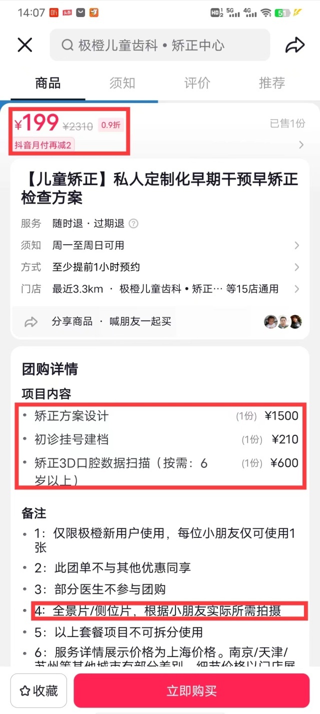 0.9折和1.5折确实带给消费者很大的诱惑,但我们很好奇,团购项目中同名的矫正方案设计服务为何竟然能标注1500元和800元两个相差近1倍的价格?是否不同渠道下单的同名服务内容有所区别?然而,我们特意咨询了极橙儿童齿科矫正中心(人民广场店)服务热线,而工作人员表示该方案在不同平台团购,具体服务内容其实完全是一样的。