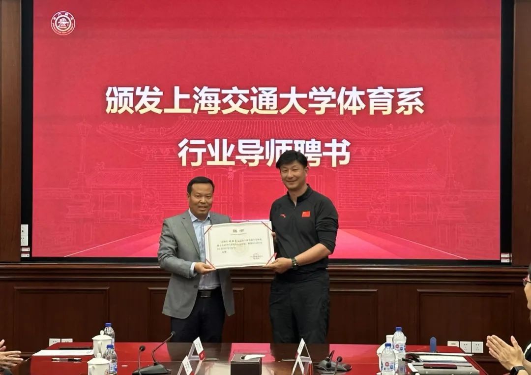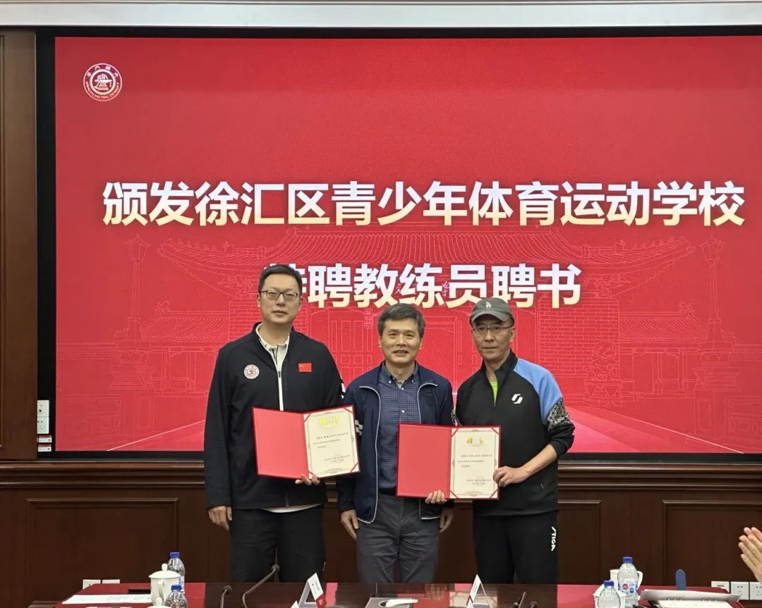 徐汇区青少年体育运动学校为上海交大高水平乒乓球队主教练、前乒乓国手丁松和上海交大高水平男子篮球队主教练徐扬颁发“特聘教练员”聘书。