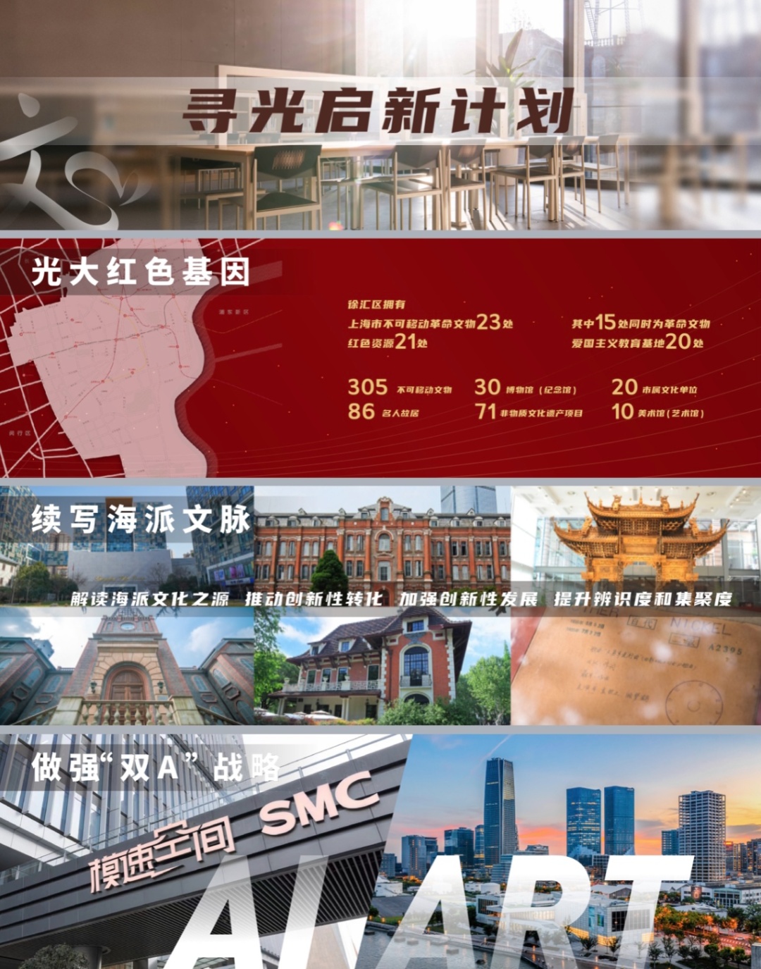 着力光大红色基因、续写海派文脉和做强“双A”战略(“双A”即AI和ART)。徐汇区域内的红色资源丰富深厚,将挖掘、塑造、提升一批更有影响力的、更能引发强烈精神共鸣的红色文化IP来串珠成链;同时徐汇将进一步解读“海派文化之源”在城区精神特质上的价值引领,以百年电影、百年建筑、百年音乐等为抓手,对海派文化资源进行创造性转化和创新性发展。