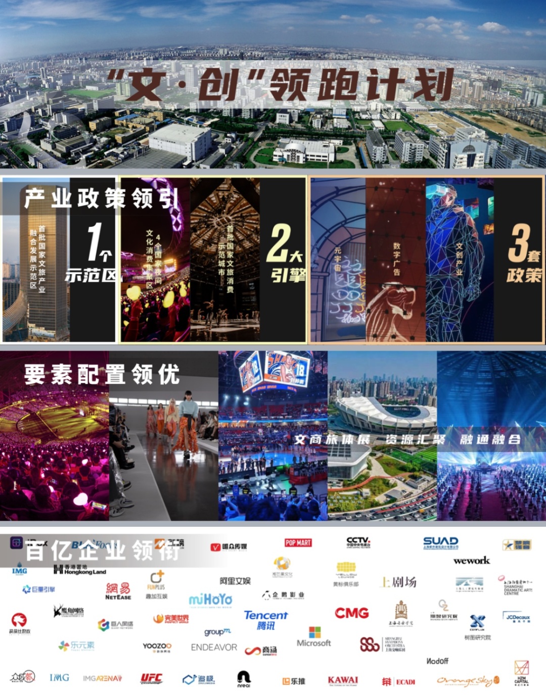 着力产业政策领引,要素配置领优,百亿企业领衔。徐汇将坚持“1+2+3”的文创产业政策方向——即打造1个示范区(首批国家文旅产业融合发展示范区)、2大引擎(“首批国家文旅消费示范城市”和“衡复音乐街区等4个国家夜间文化消费集聚区”)、3套政策(文创产业、数字广告、元宇宙),以政策扶持、消费带动、招大引强为主线,形成徐汇文创产业高质量发展之势。