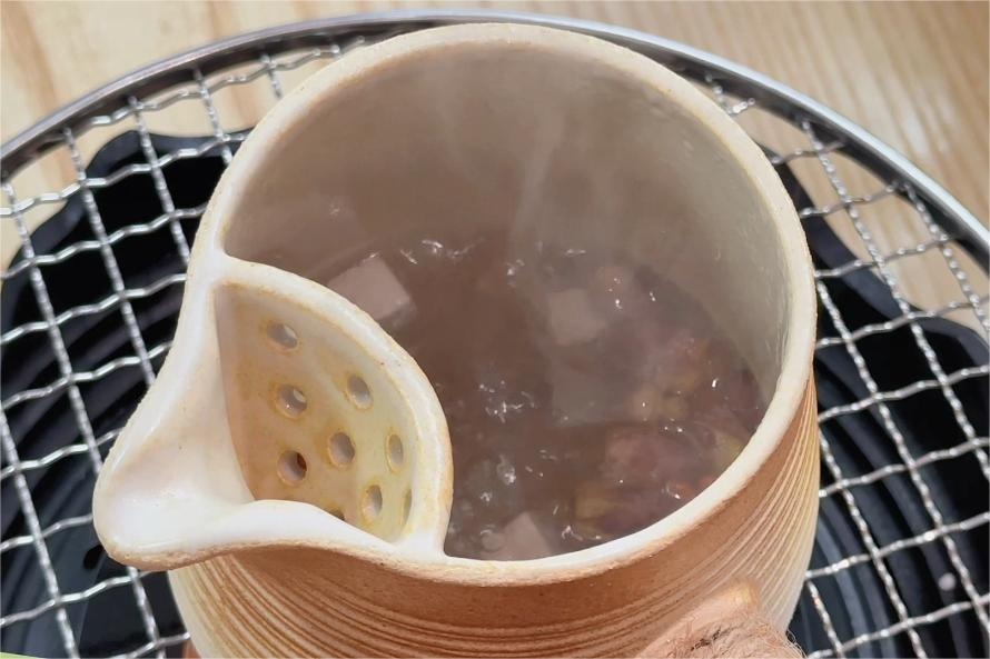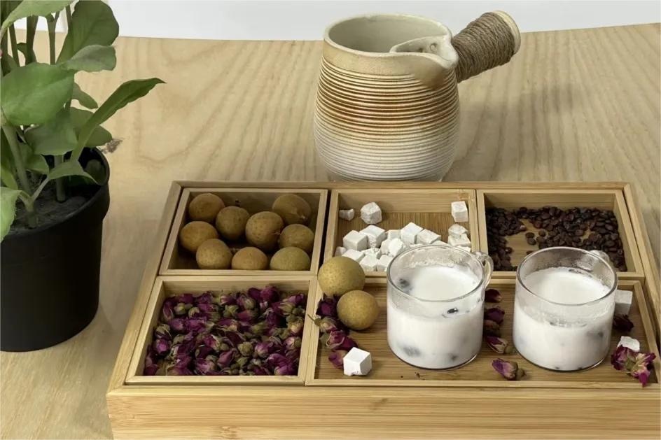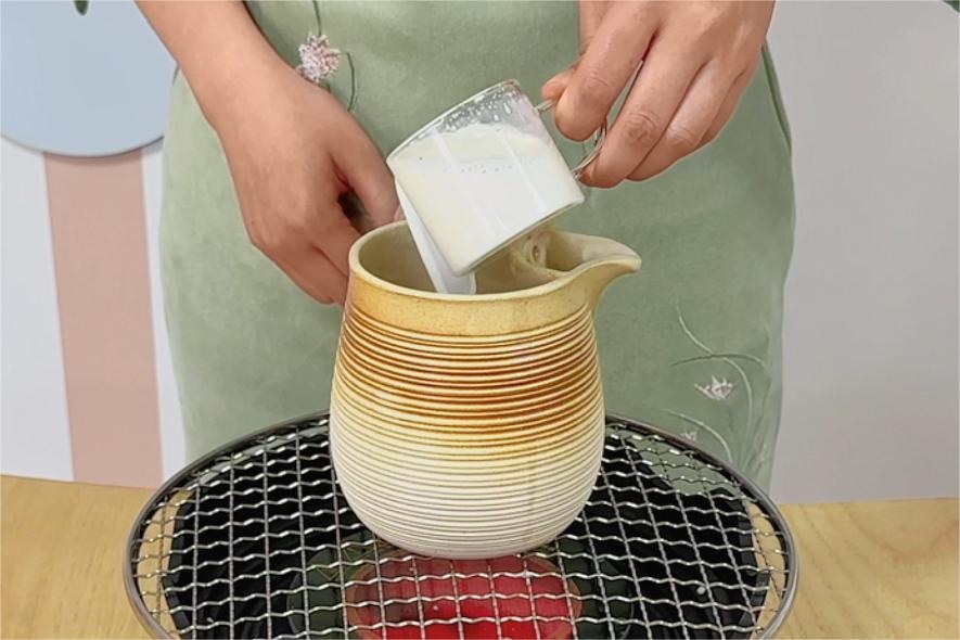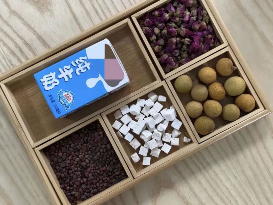 酸枣仁5克,茯苓3克,桂圆5克,玫瑰花5克,牛奶100毫升,清水1000毫升酸枣仁别名酸枣、北酸棘仁,性耐干旱。其味酸、性平,功效是养心补肝,安神除烦。茯苓别名玉灵、万灵桂,性喜温暖。其味甘淡、性平,功效是健脾和胃,宁心安神。桂圆又名龙眼肉,其味甘、性温,功效是补益气血,安神定志。玫瑰花别名徘徊花、湖花,其味甘、性温,功效是疏肝解郁,调和肝脾。先将酸枣仁捣碎,与其他材料加入水中浸泡15分钟,将酸枣、茯苓、玫瑰花、桂圆放入水中煮沸。