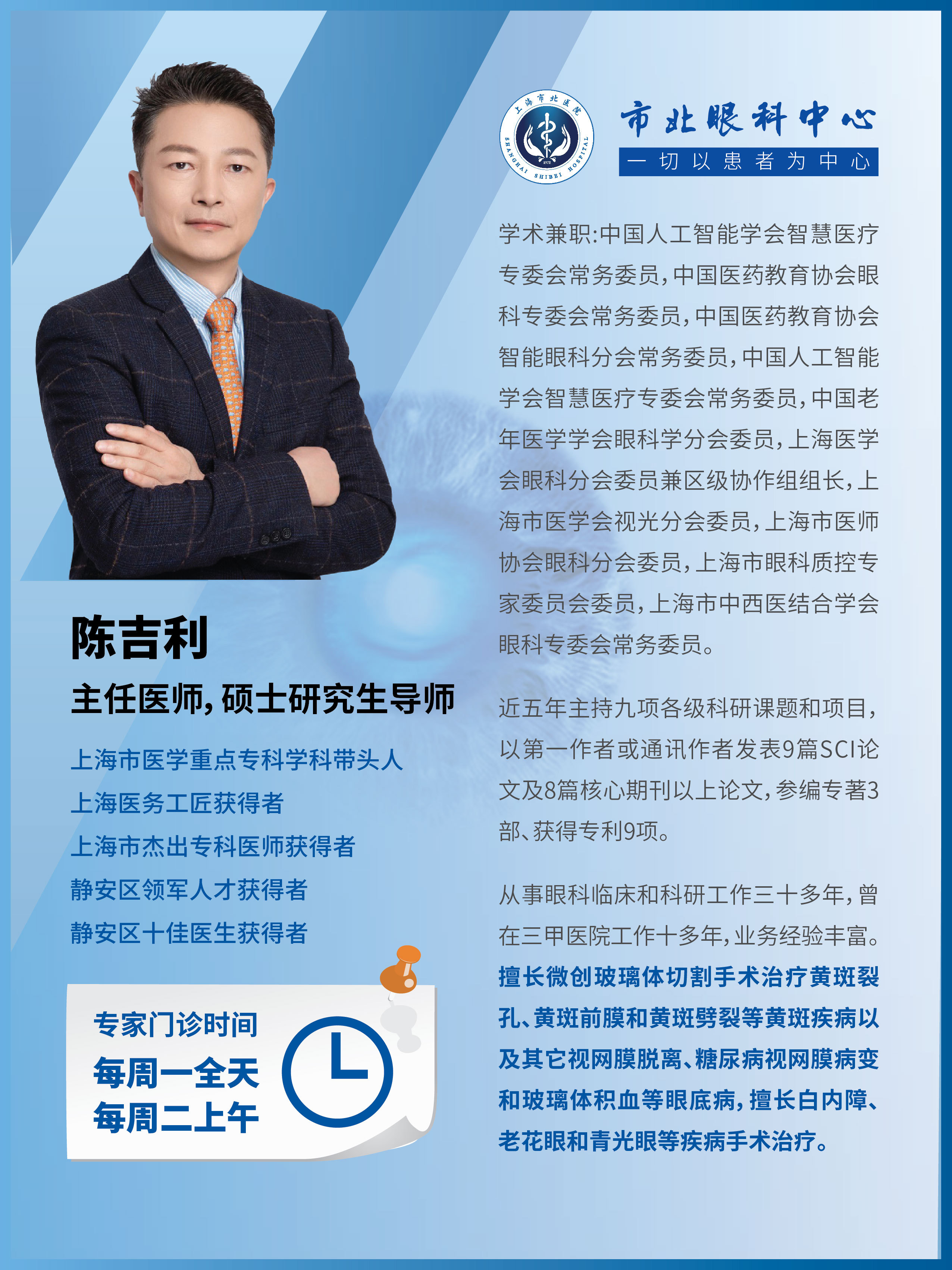 据介绍,市北医院眼科中心由获得“上海医务工匠”“上海杰出专科医师”和“静安区领军人才”称号的主任医师陈吉利领衔,有各类医务人员12人,其中中高级职称和博士、硕士研究生学历占67%,目前是上海区级医院眼科唯一的上海市医学重点专科,2019年获得上海市卫生系统优秀集体称号,2021年区级医院科技竞争力排名全市第一;眼科还是华东区域干眼示范中心,上海市创新医疗器械应用示范基地,Airdoc上海人工智能眼科应用示范基地。