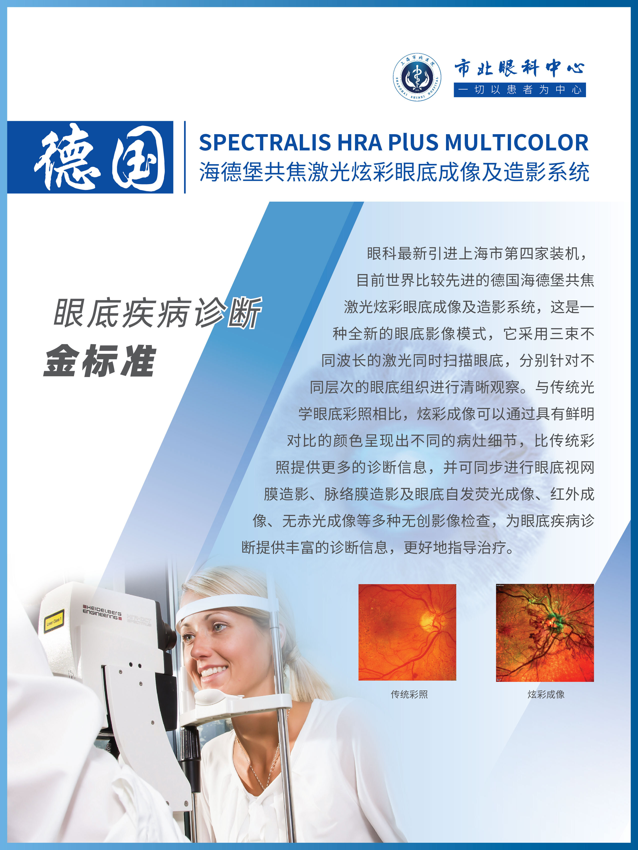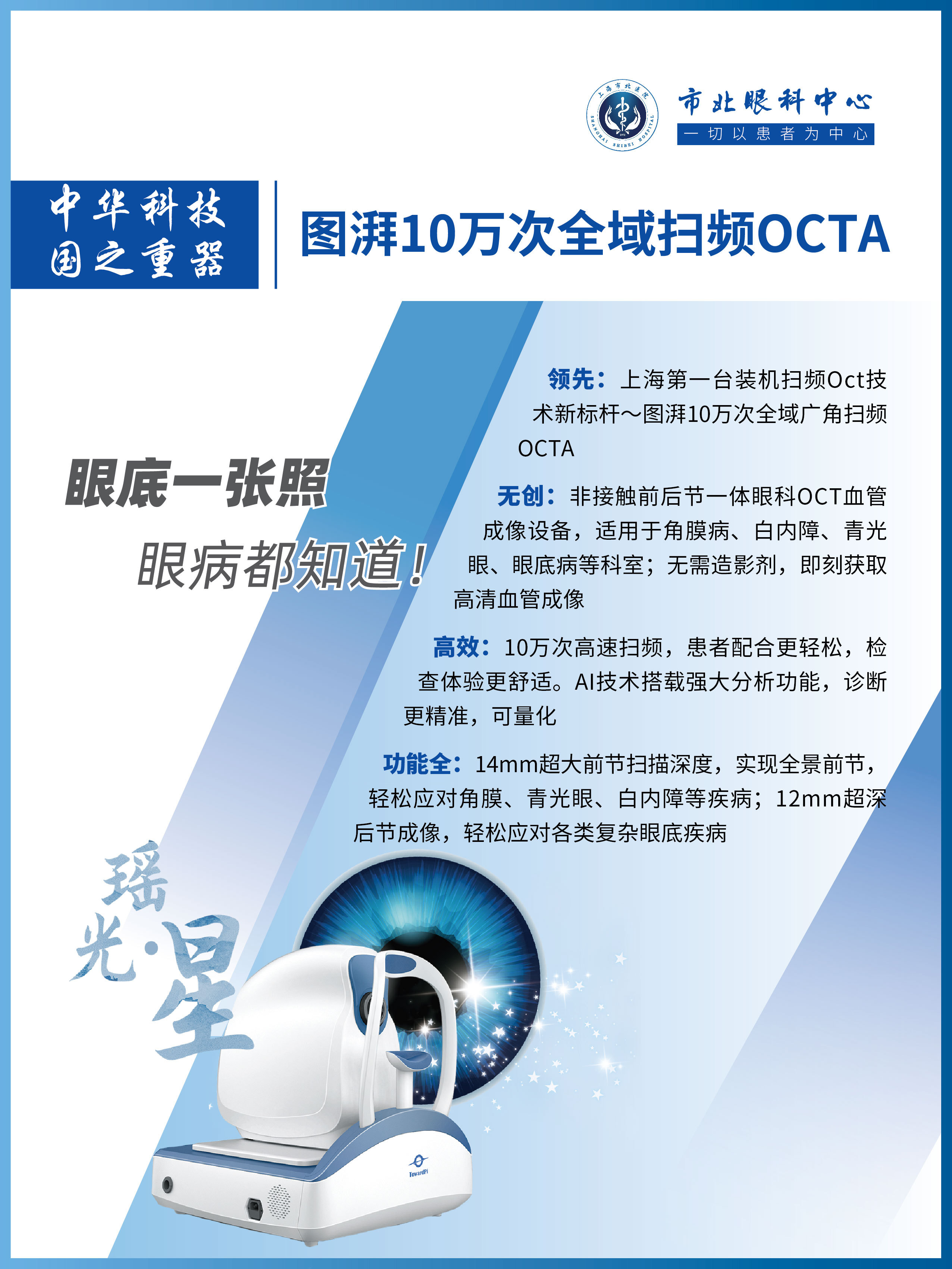 目前,市北眼科各类国际先进检查设备齐全,眼科拥有图湃扫频OCTA(上海第一台装机)、德国蔡司广角眼底照相机(上海市第三台装机)、美国科以人OPT干眼激光治疗系统(上海市第二台装机)、英国欧堡眼底超广角激光成像系统、德国炫彩多模式眼底造影系统及德国蔡司手术显微镜、美国爱尔康眼前后节手术系等先进设备。