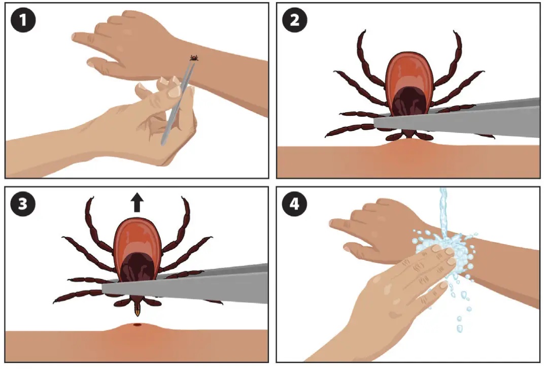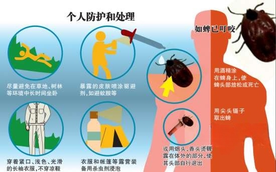 五月正是亲近自然的好时节, 市民朋友们在赏花或者露营时 要小心“蜱虫病”哦 1 什么是蜱虫病 蜱虫病,又称发热伴血小板减少综合征,是2009年中国学者首次发现报道的新发蜱传传染病。该病是由新型布尼亚病毒感染引起的急性传染病,多分布在丘陵、山区地带。 蜱是该病的传播媒介,蜱叮咬传播是该病的重要传播途径之一。蜱叮咬携带病原体的宿主动物后,再叮咬人时,病原体随之进入人体引起发病。此外,急性期病人血液和血性分泌物具有传染性,直接接触病人血液或血性分泌物可导致感染。 2 临床表现 感染这种病毒后,一般要经过1~2周(潜伏期)。然后突然急性起病,主要临床表现为发热,体温多在38℃以上,重者持续高热,可达40℃以上,部分病例热程可长达10天以上。伴有乏力、厌食、恶心、呕吐等,部分病例有头痛、肌肉酸痛、腹泻等。查体常有颈部及腹股沟等浅表淋巴结肿大伴压痛、上腹部压痛及相对缓脉。血常规检测可以发现白细胞和/或血小板进行性下降。 少数病例病情危重,出现意识障碍、皮肤瘀斑、消化道出血、肺出血等症状,可因休克、呼吸衰竭、弥漫性血管内凝血等多脏器功能衰竭死亡。 绝大多数患者预后良好,但既往有基础疾病、老年患者、出现精神神经症状、出血倾向明显、低钠血症等提示病重,预后较差。近十年的统计结果显示病死率约5%。 3 如何预防蜱虫病 1.生活在丘陵、山地、森林等地区居民,平时要注意清理和杀灭家居环境中游离蜱和饲养家畜身上附着的蜱。 2.避免在蜱类主要栖息地,如草地、树林等环境中长时间坐卧。同时做好个人防护,如穿长袖衣服,扎紧裤腿或把裤腿塞进袜子或鞋子里,穿浅色衣服可便于查找有无蜱附着;针织衣物表面应当尽量光滑,这样蜱不易粘附;不要穿凉鞋。裸露的皮肤涂抹驱避剂,如避蚊胺、派卡瑞丁、伊默宁(又叫驱蚊酯),是抗蜱较为有效的药剂。 3.回家后及时洗澡,淋浴有助于洗掉未附着的蜱虫。检查腋窝、腹股沟、头皮、颈部、腰部及脚踝下方等皮肤褶皱、薄弱部位有无蜱附着。 4.如果同时携带宠物,需及时检查宠物耳部、腹股沟等部位有无叮咬的蜱,并注意切勿徒手捕捉宠物身上的蜱虫或其他寄生虫并进行挤捏。 5.除防范蜱虫叮咬外,医务人员和陪护人员接触病人时也要采取个人防护措施,避免接触病人的血液、体液、血性分泌物、排泄物及被其污染的环境和物品。 4 蜱虫叮咬如何取出 01 正确处理方式 ★用尖头镊子尽可能靠近皮肤表面夹住蜱虫。 ★用稳定、均匀的力在垂直于皮肤方向把蜱虫拉出,拉出过程不要扭动或猛拉,避免把蜱虫捏碎或扭断头部。 ★取出后切勿用手指压碎蜱虫,可通过将取出的活蜱放入酒精、密封袋/容器或将其冲入马桶中来处理。 ★如果发生口腔部分脱落并留在皮肤中,用镊子取出口腔部分。 ★要是不能用镊子轻易地取出,也不要过于担心,可不动,让皮肤愈合。 ★清除蜱虫后,用碘酒、酒精或肥皂和水彻底清洁叮咬部位和双手。 ★如无把握,应尽快找到最近的正规医院,让医生处理。 ★如果您在去除蜱虫后的几周内出现皮疹或发烧,请去看医生。一定要告诉医生您最近被蜱虫叮咬、叮咬的时间以及您最有可能被蜱虫叮咬的地方。 02 错误处理方式 ★用火烧、用烟头烫,利用热能让蜱虫与皮肤分离。 ★抹指甲油,刺激蜱虫离开皮肤。 ★用凡士林涂抹蜱虫,让蜱虫脱落等等。