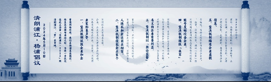 围绕进一步优化营商网络环境,“清朗浦江•杨浦倡议”发布,呼吁坚决抵制诋毁企业和企业家形象声誉、坚决抵制侵犯企业家个人隐私和企业商业秘密、坚决抵制以“舆论监督”名义向企业索要利益、坚决抵制操纵“水军”账号发帖攻击企业、坚决抵制编造企业虚假信息。