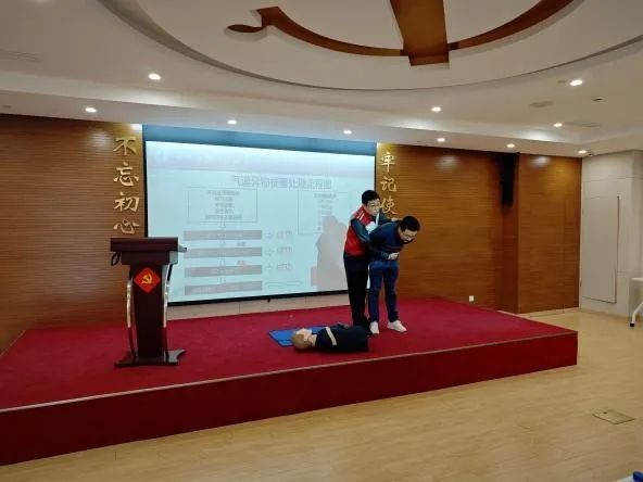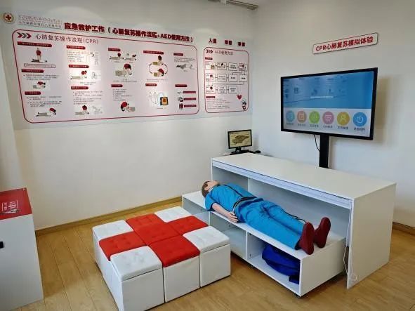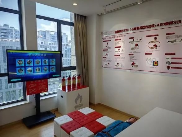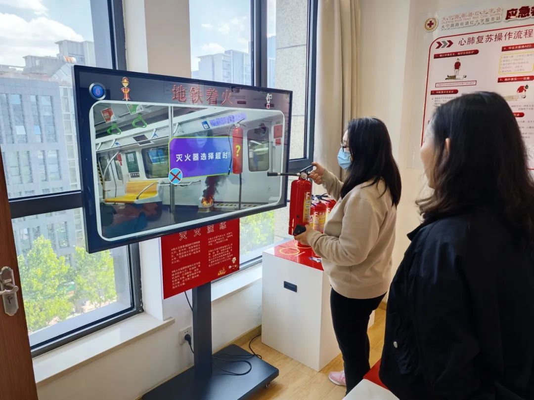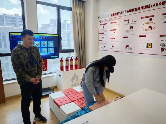 培训老师着重介绍了心肺复苏术、气道异物梗阻等急救培训核心知识。同时,结合站内各类模拟体验设备,通过“场景式+情景式”的体验方式,参与人员轮流模拟实操心肺复苏、消防灭火、触电等应急救护技能。