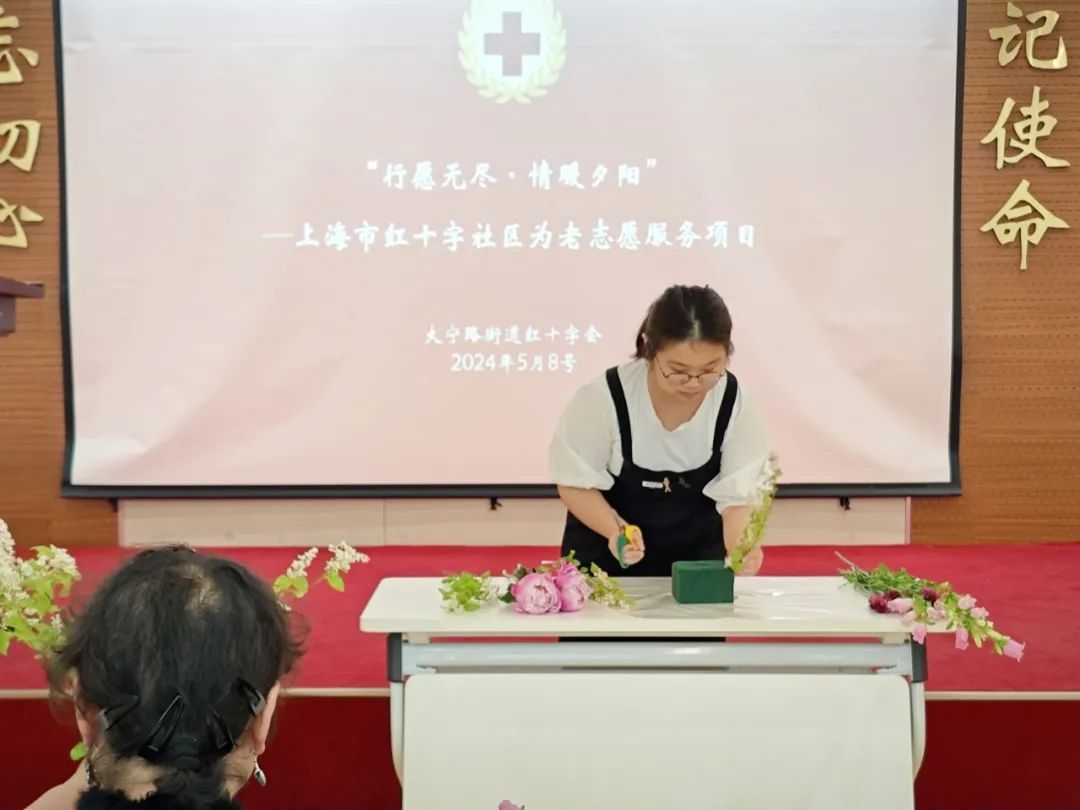 现场还邀请了上海农林职业技术学院红十字会志愿服务队为志愿者们开展“行愿无尽 情暖夕阳”系列主题插花活动,旨在提升志愿者的凝聚力和归属感,进一步激发志愿者的活力和服务动力。