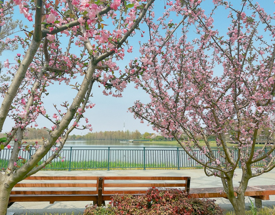 在星愿公园,沿湖形成大片的生态湿地,繁花似锦、禽鸟嘤嘤。从木质栈道、观景平台、观景亭、游船码头等处远远眺望,湖内生态岛、大型喷泉、迪士尼乐园酒店、申迪文化中心等等,一步一景。这个充满美景的公园,无疑是市民游客漫步赏春的好去处。