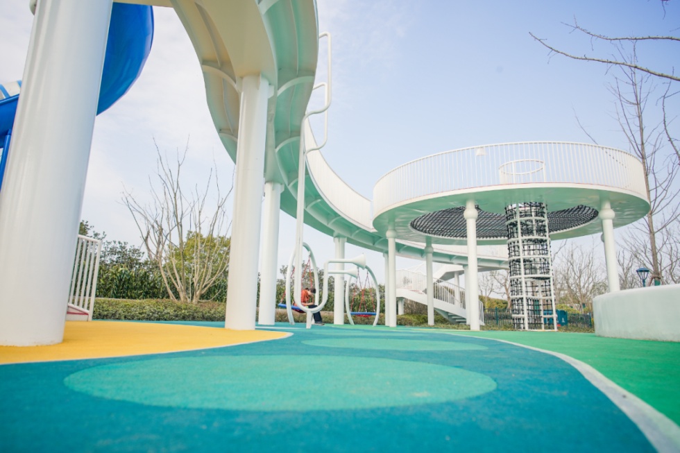 贴心的是,10公里跑道上依次树立着从1km到10km的标识牌。沿途还增设了功能服务设施,如跑步更衣室、卫生间、休息驿站等。不少驿站的设计充满亮点,走累时可以在像是蒙古包似的休息驿站小憩。道路旁,还有各种类型色彩斑斓的儿童游乐设施,为带着孩子前来健身的人们增添童趣。