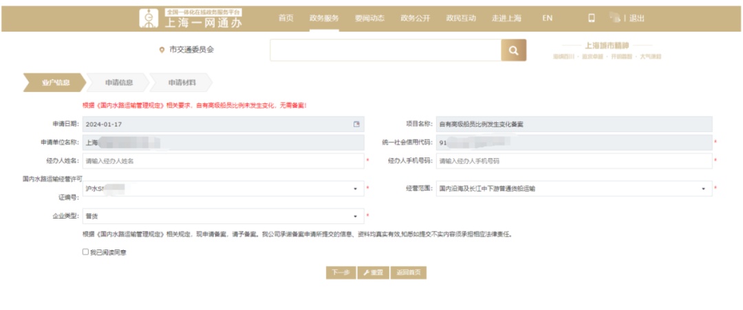 服务搜索栏输入“水路运输业经营信息变动备案”,搜索到要办理的事项名称,点击“立即办理”,进入申请页面。